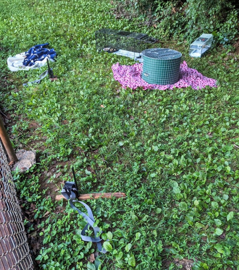Early that evening, my focus shifted. I planned to stay up all night and watch the cameras from my phone. Margarita had begun to show up in the wee hours, and it was time to consider the Hail Mary of Rare Exceptions: the open trap. Ashley was on call in case a raccoon or other creature needed to be released, as she was five short minutes away from Margaritaville. My really great husband rode along and helped me reconfigure the three traps and two cameras. The food lure wafted the hot scent of chicken and pork fried in bacon grease into the heavy summer-night air. We rearranged Margaritaville to suit our little diva, then left the scene about 8:30pm.