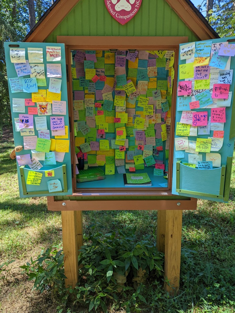 One day many months later, I woke up knowing. I would build little pet chapels and install them in public places around our city and county to start, and then expand throughout the state, or region, or country. Visitors could participate by sharing the names and stories of the animals they loved, including the ones who had passed as well as the ones still living, or they could simply stop by and witness the heartfelt sentiments pasted to the walls and maybe read a personal story or two in the journal.
